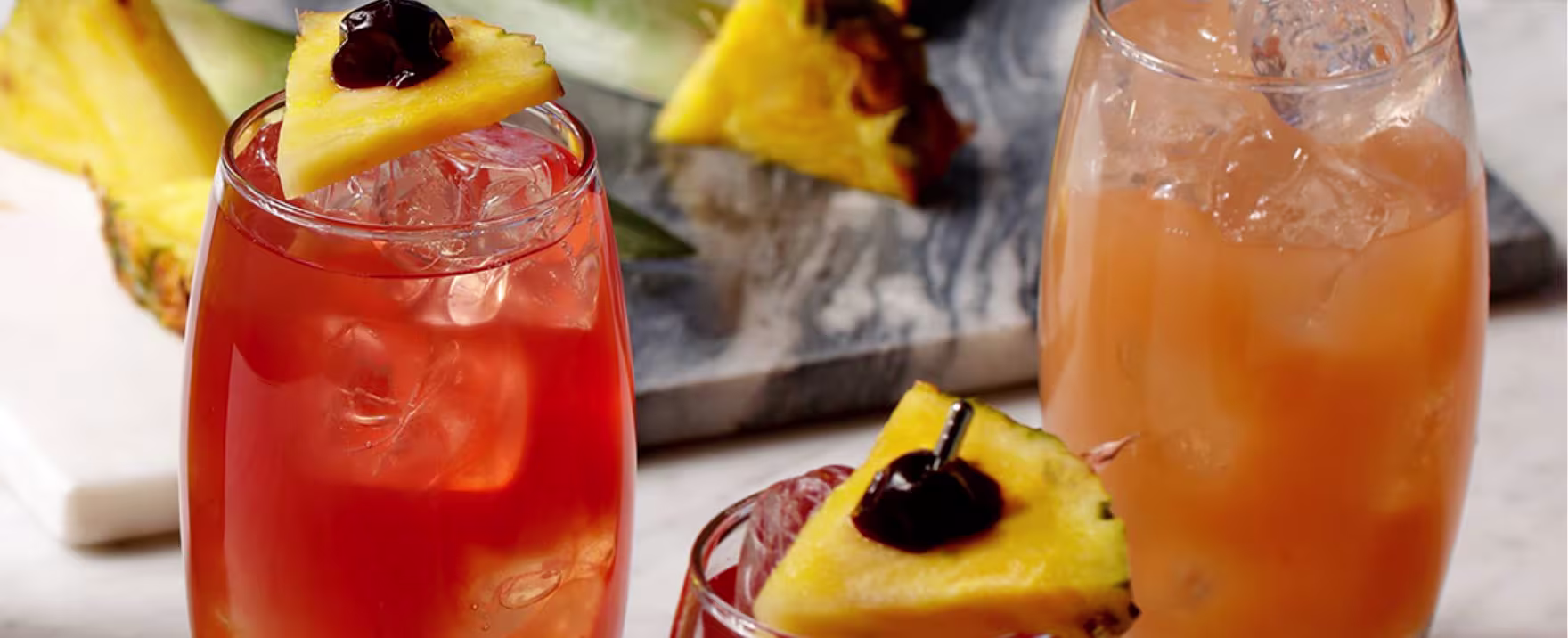 Cut a slice of pineapple with a sharp knife on a cutting board and slot over the side of the glass to garnish.